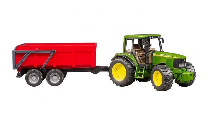 Set van Bruder bestaande uit een John Deere 6920 landbouwtractor en een rode kipper aanhangwagen. Met het stuurverlengingssysteem via het dak is de tractor makkelijk te besturen tijdens het spelen.