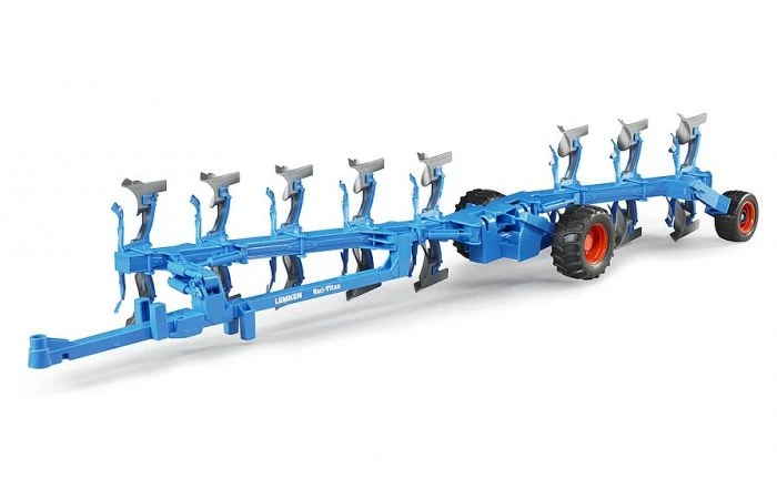 Zeer grote Bruder 2250 Lemken draaiploeg, die op alle mogelijk manieren te verstellen is. Steunwiel is om te klappen en de as kan omhoog. Deze ploeg is aan alle tractoren van Bruder te vestigen.