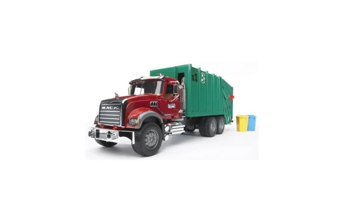 De vuilniswagen is voorzien van een vuilnisopbouw, waarvan de achterzijde gekanteld kan worden, zodat het geladen afval ook weer gestort kan worden. De (meegeleverde) vuilnisbakken (2x) kunnen via draaiknop worden geleegd in de bak. (deze vuilniswagen kan ook de grote grijze container legen). De deuren van de cabine kunnen open, zodat ook Bruder figuren gebruikt kunnen worden.