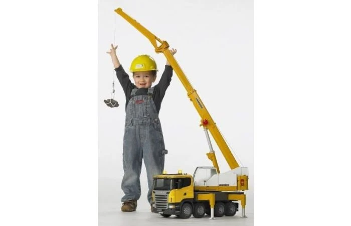 Deze indrukwekkende Liebherr kraanwagen torent letterlijk uit boven het aanbod bedrijfswagens van Bruder. Wanneer de kraan is uitgeschoven, heeft hij al een behoorlijke hoogte en hij kan zelfs verder uitgeschoven worden met een extra boom. De kleine spelers zullen onder de indruk zijn, want wanneer de kraan helemaal is uitgeschoven met de extra boom en rechtop staat, is hij 1,30 meter hoog en torent zelfs boven sommige kleine bouwers uit. Omdat de kraan zo hoog is, moet hij natuurlijk ook stabiel staan. Met de zwenkbare en apart verstelbare steunpoten staat de kraan heel stabiel en wordt voorkomen dat hij omvalt. Voor nog meer stabiliteit kan het tegengewicht worden gebruikt, net als bij een echte kraan. Om ervoor te zorgen dat die zwaar genoeg is kan hij gevuld worden met zand.