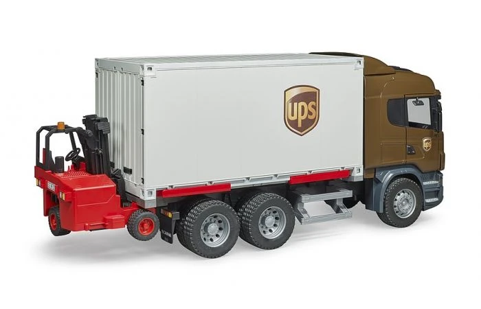 De wereldwijd opererende verzenddienstverlener UPS vertrouwt ook op deze krachtige truck. BRUDER biedt deze versie nu aan met drie assen, een verwisselbare containerunit en een mobiele heftruck. Hierbij kan de containerbeslag van het trekkervoertuig worden afgebroken tot afzonderlijke onderdelen en beschikt hij over draaideuren aan de achterzijde. Een extra, uitstekende optie van dit voertuig is de verwisselbare eenheid die automatisch kan worden vrijgegeven uit het voertuig door het uit te trekken en de steunpoten uit te breiden om de container op te krikken en de truck in staat te stellen zich van het apparaat af te bewegen. De cabine volgt het typische, dynamische ontwerp van Scania. Het vouwen van buitenspiegels en beglazing van hoogwaardig kunststof zijn een gegeven, evenals het openen van deuren of de mogelijkheid om de Licht- en Geluidsmodule te installeren.