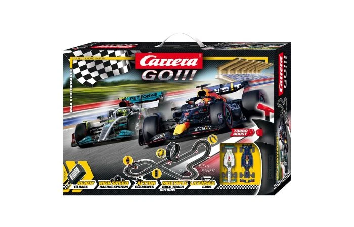 Formule 1 Wereld Kampioenschap Rematch: Mercedes tegen Red Bull Racing! Dit is een kleinschalige battle tussen de belangrijkste rivalen voor het 2021 F1 wereldkampioenschap. Met de Carrera GO!!! Max Performance set staat junior racers toe om de spannende Formul 1 hondengevechten tussen Max Verstappen en Lewis Hamilton op elk gewenst moment na te spelen. Twee handbediende controllers met een turboknop stuwen Mercedes-AMG F1 W13 E Performance Hamilton, No.44 en Red Bull Racing RB18 Verstappen, No.01 op topsnelheid over lange rechte stukken en door bochten. Racecoureurs hebben absolute precisie nodig om de fly-over, de lus en de kruising te navigeren. Werkt met een lichtnet adapter. Geschikt vanaf 6 jaar.