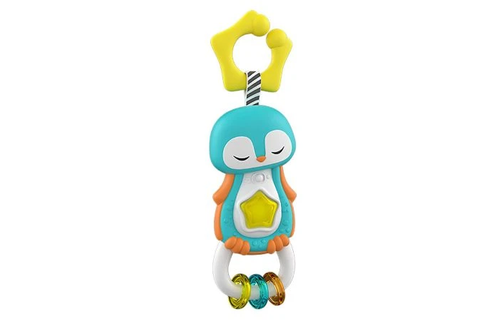 Een zoete pinguïnvormige rammelaar is de perfecte metgezel voor de ontspanning van de baby in de vroege maanden. Een stervormige lichtgevende knop licht op om de aandacht van het kind te trekken, terwijl de vele ontspannende deuntjes een kalmerend effect hebben. Schudden met de rammelaar zorgt ervoor dat de hangers een grappig geluidseffect creëren, terwijl de praktische ring ideaal is voor het bevestigen van de pinguïn aan de wieg of de wandelwagen. Is geschikt voor kinderen vanaf 3 maanden.