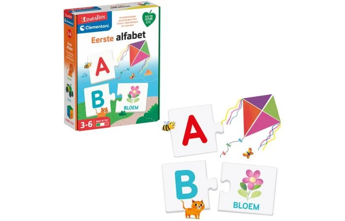 Clementoni Mijn eerste alfabet. De Z van zoen, die mama me geeft… een leuk educatief spel om kinderen de letters van het alfabet te leren. Met 58 geïllustreerde kaarten leert het kind de letters van het alfabet te combineren met bekende, alledaagse voorwerpen en gebeurtenissen. Dit leerspel uit de Play for Future lijn is gemaakt met gerecyclede materialen. Geschikt voor kinderen vanaf 3 jaar.