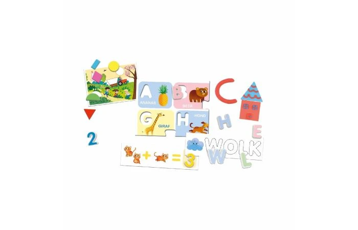 Ook inbegrepen zijn geïllustreerde kaarten om compleet te maken met de kartonnen vormen en een set kaarten met woorden om met de plastic letters te schrijven. Daarnaast veel kaarten met de eerste optelsommen, om te spelen met de plastic getallen, en kaarten met suggesties om voorwerpen en dieren te maken met plasticine.