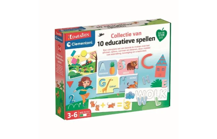 Clementoni leerspel 10 spelletjes in 1. Deze activiteitenset biedt werkelijk alles wat kleuters nodig hebben om het alfabet, cijfers, vormen en kleuren te leren door middel van aanraking, beweging en creativiteit. En voor meer actie zijn er ook kaarten die het kind uitdagen om met zijn lichaam letters uit te beelden of simpele oefeningen te doen terwijl het telt. Een compleet spel om kleine kinderen te helpen typische kleuterbegrippen te leren. Geschikt voor kinderen van 3 tot 6 jaar.