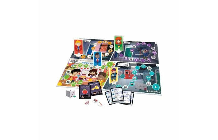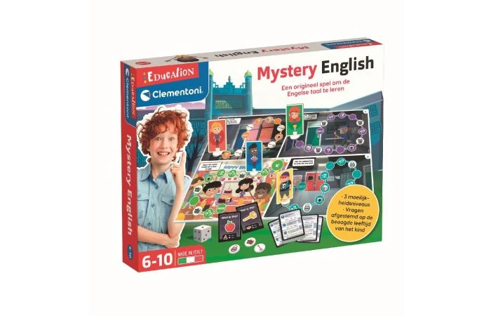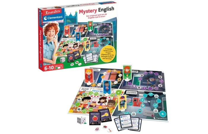 Clementoni Ik leer Engels. Een origineel en mysterieus bordspel om op een eenvoudige en leuke manier Engels te leren! Beantwoord de vragen, verzamel alle voorwerpen om uit de ruimtes te komen, versla je tegenstanders en arriveer als eerste op het feest! Nog meer plezier met de educatieve app, ontwikkeld in samenwerking met het British Institute. Geschikt voor kinderen vanaf 4 jaar.