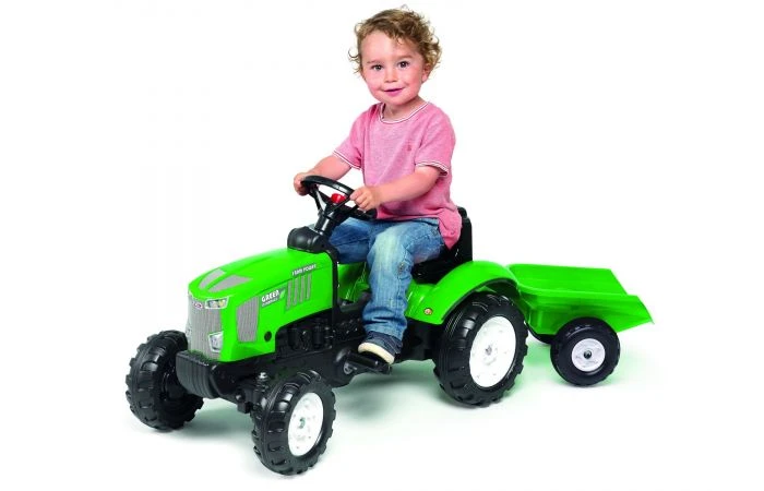 Deze prachtige Falk Farm Power tractor in een coole groene kleur lijkt precies op echte tractoren. In de laadbak kan alles meegenomen worden – van speelgoed tot zand en hooi! Door het verstelbare zitje kan de tractor met uw kind meegroeien. De kunststof wielen zijn zeer slijtvast en de aanhanger is zeer makkelijk te koppelen en ontkoppelen. Dit maakt de Falk Farm Power geschikt voor kinderen vanaf 2 jaar, met een maximum gewicht van 30 kilogram. Toet toet, laat met je toeter iedereen weten dat je de hoek om komt!