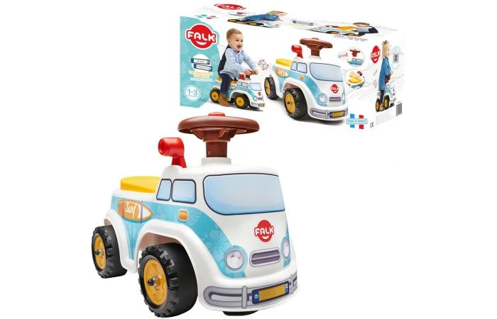 Schattige surfer minibus van Falk. Met zijn mooie ronde vormgeving en felle kleuren wordt dit vast het favoriete loopfiguur van jouw kindje! Deze minivan is super wendbaar dankzij het directionele stuur met claxon. Hij heeft ook een uitstekende stabiliteit, zodat jouw kindje zijn of haar motorische vaardigheden veilig en in stijl kan ontwikkelen! Er is een klein opbergvak verborgen onder de stoel. Ideaal om wat zandspeelgoed mee te nemen om op het strand te spelen. Voorzien van aanpasbare nummerplaat om een naam op te schrijven, of een bijnaam te geven aan deze leuke ride-on!Â