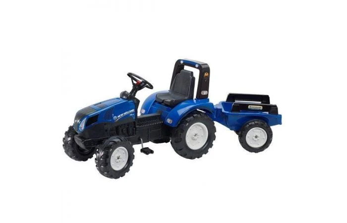 Deze Falk ‘New Holland’ blauwe traptractor is uitgevoerd in origineel New Holland design, heeft een totale lengte van 162 cm en wordt geleverd inclusief aanhanger. Een mooie traptractor van een robuuste kwaliteit, met kunststof wielen die zeer slijtvast zijn en het stuur bevat een toeter met geluidsfunctie. De aanhanger is makkelijk te koppelen en te ontkoppelen; zo kan er van alles vervoerd worden. Het zitje is in verschillende standen te monteren en is hierdoor geschikt voor kinderen vanaf 3 jaar en tot een gewicht van max. 50 kg.  Afmetingen: 162 x 54 x 66 cm. Geschikt voor kinderen vanaf 3 jaar.     Â