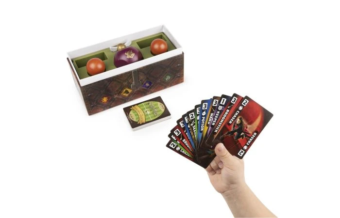 Haal de snelheid en opwinding van een echte Zwerkbalwedstrijd bij je thuis met Vang De Gouden Snaai, een Zwerkbalspel voor heksen, tovenaars en dreuzels. Iedereen speelt tegelijkertijd terwijl de kaarten snel van speler naar speler worden doorgegeven, waarbij iedereen probeert sets te bouwen en punten te verdienen. In het midden van de actie ligt een open Zwerkbalkist, met een Slurk, twee Beukers en het allerbelangrijkste, de Gouden Snaai. Wanneer je bepaalde kaarten neerlegt, komen deze magische items tevoorschijn om te spelen! De actie gaat sneller dan een Nimbus 2000 als kaarten van hand wisselen, sets op tafel komen en Beukers hun doel bereiken. Wanneer de Gouden Snaai vanuit de kist de lucht in schiet, grijp hem dan! Het spel eindigt wanneer de Gouden Snaai gevangen wordt: de speler met de meeste punten wint. Geschikt voor 3 tot 4 spelers vanaf 8 jaar.