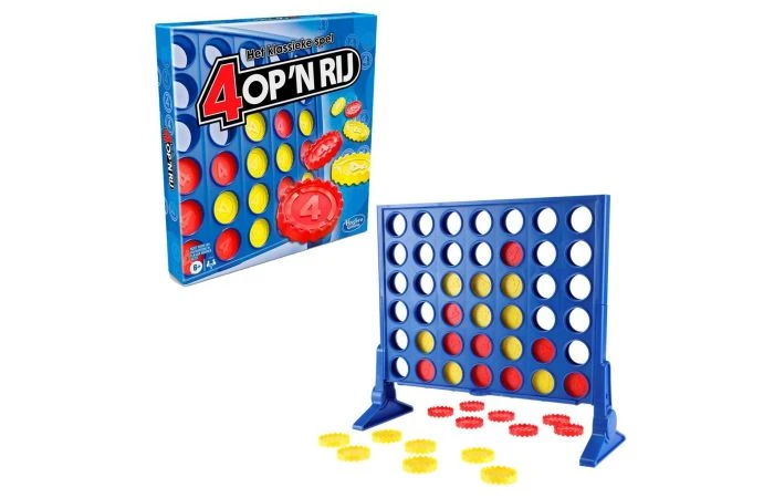 Daag je vrienden uit voor een lekker spannend spel met het originele 4 op ’n rij! Laat je rode of gele schijfjes in het speelraam vallen en zorg dat jij als eerste 4 op ’n rij hebt. Als je tegenstander te dicht bij 4 op ’n rij komt, blokkeer je hem of haar met een schijfje van jou! De speler die wint, trekt het schuifbalkje opzij om alle schijfjes eruit te laten vallen en het spel kan opnieuw beginnen! Geschikt voor 2 spelers vanaf 6 jaar.
