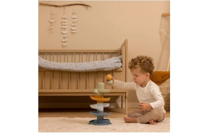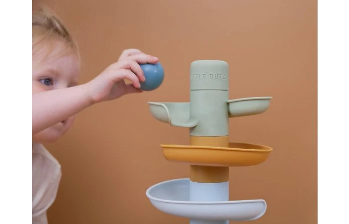 Laat de bal maar rollen! De spiraaltoren van Little Dutch zorgt voor eindeloos veel speelplezier. Deze kleurrijke set bestaat uit 5 subtiel gekleurde delen die jouw kleintje gemakkelijk op elkaar stapelt. Laat de ballen een voor een op de bovenste laag vallen en kijk hoe ze achter elkaar naar beneden rollen en slingeren. De spiraaltoren draagt bij aan de ontwikkeling van de hand-oog coördinatie en leert kleintjes over oorzaak en gevolg, waarmee het zowel leuk als leerzaam spelen is. Bij de spiraaltoren zitten standaard 3 lichte en gemakkelijk vast te pakken ballen in verschillende kleuren die bij beweging een geluidje maken. Dit speelgoed is uitgevoerd in de kenmerkende Little Dutch kleuren donkerblauw, blauw, lichtblauw, groen en okergeel. De afmeting is: 18 x 18 x 30 cm. Geschikt voor kinderen vanaf 18 maanden.