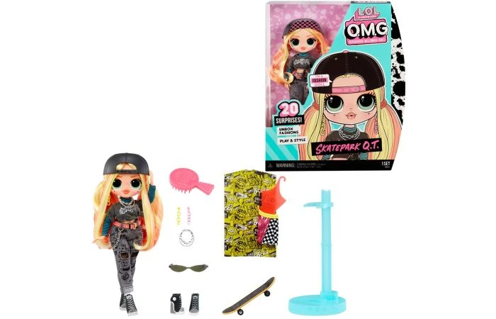 Maak kennis met de gloednieuwe LOL Surprise OMG.-modepop Skatepark Q.T. met 20 verrassingen! Skatepark Q.T. heeft een verbluffend mooi gezichtje, prachtig haar en haar eigen coole streetwear-stijl. Bovendien is ze de grote zus van het populaire L.O.L. Surprise-personage Sk8r Grrrl. De nieuwste L.O.L. Surprise O.M.G.-modepoppen zijn onverwachte BFF’s. Ze vieren de verschillen tussen vriendinnen waardoor ze elkaar sterker maken. Hoewel ze allemaal anders zijn, houden ze elk van hun eigen dingen, en vinden ze het belangrijk om zichzelf te blijven, ongeacht in welk gezelschap ze zijn. Elke doos is inclusief een L.O.L. Surprise OMG-modepop, 2 outfits, schoenen, accessoires, haarborstel en poppenstandaard. Verzamel beide limited edition L.O.L. Surprise O.M.G.-poppen, Skatepark Q.T. en Trendsetter! Wordt geleverd in fraaie windowbox. Geschikt voor kinderen vanaf 4 jaar.