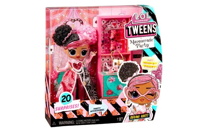 Je bent uitgenodigd voor de party van het jaar met de L.O.L. Surprise Tweens Masquerade Party-modepop Regina Hartt. Regina is de koningin van haar crew en bereidt zich voor om op een dag de baas te zijn. Regina staat altijd klaar om te dansen. Trek haar de rok en de hakken aan en zet haar het masker op voor een tweede partylook. Pak 20 verrassingen uit, waaronder een Tweens-modepop met een supermooi gezichtje, prachtig haar en haar eigen glamoureuze stijl. Elke doos is inclusief een L.O.L. Surprise Tweens-modepop, een opvallende partyoutfit, 2 paar schoenen, 1 paar hartjesoorbellen, haarclips in de vorm van een kroontje, een handtas, een maskerademasker, een halsketting, een parelriem, een make-updoosje, een make-upkwast, een camera, een rekwisiet voor in een fotohokje, een haarborstel en een poppenstandaard. Wordt geleverd in windowbox en is geschikt voor kinderen vanaf 4 jaar.