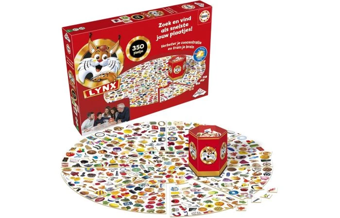 Verbeter je concentratie en train je brein met Lynx! Zet het spelbord in elkaar, schud de kaartjes en pak er 3. Zoek en vind als snelste jouw plaatjes. Waar zijn de koekjes, de gitaar en de tennisbal? Vind als eerste jouw 3 plaatjes op het bord en win! Doordat het spelbord als een puzzel in elkaar zit, zijn de verschillende puzzelstukken steeds op een andere manier in elkaar te leggen. Denken jouw medespelers je dus te slim af te zijn door de volgorde van de afbeeldingen te onthouden? Wissel de puzzelstukken en je hebt weer een compleet nieuwe uitdaging om jouw afbeeldingen als eerste te vinden. Geschikt voor 2 of meer spelers vanaf 6 jaar.