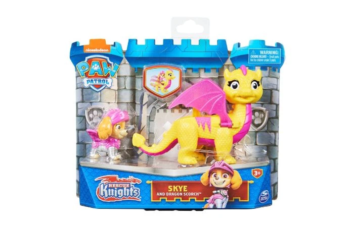 Ga mee met je favoriete pups en hun nieuwe drakenvriendjes, en beleef spannende reddingsmissies met de Rescue Knights Pup en Draak-sets. Deze set actiefiguren bevat Skye en haar trouwe drakenvriendje Scorch. De geliefde pup van Paw Patrol draagt haar Rescue Knights-harnas en is klaar om in actie te komen. Druk op de badgeknop van Skye om het gereedschap in haar rugzak te transformeren en open te klappen. Klem Skye vervolgens op de rug van Scorch en druk op de knop op de staart om de glinsterende, doorzichtige vleugels te laten bewegen. Deze geweldige set brengt al het middeleeuwse plezier van de populaire tv-serie tot leven. Verzamel alle Rescue Knights Pup en Draak-sets en gebruik je fantasie om keer op keer je eigen reddingsmissies te verzinnen. Inhoud: 1 Paw Patrol-figuur, 1 draakfiguur. Wordt geleverd in touchbox. Geschikt voor kinderen vanaf 3 jaar.