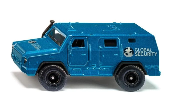 Het is tenslotte bedoeld voor belangrijke speciale inzetten als het vervoer van bijzonder waardevolle goederen of gevoelige vracht. Bankbiljetten, sierraden, belangrijke kunstwerken of geheime documenten – in de cabine van gepantserd staal is de exclusieve lading 100% veilig. De siku geldstranporter is uitgevoerd in onopvallend metallic blauw, de zijkanten zijn voorzien van het logo “Global Security”. De deuren aan beide zijkanten en aan de achterkant kunnen worden geopend. Het voertuig kan met de bijbehorende stickervellen nog verder worden vormgegeven, bijvoorbeeld met de opschriften “Geld- en waardetransport” of “GPS bewaakt” in verschillende talen. Voor bijzonder realistisch speelplezier bevat de set bovendien nog vier kleine goudstaven en vier kartonnen vellen met verdere speelelementen. Hierop staan afbeeldingen van verschillende vrachten zoals geldzakken, geldladen, schilderijen en certificaten. De voorgedrukte elementen kunnen heel eenvoudig uit het kartonnen vel worden verwijderd en in de transporter worden geplaatst. Bijzondere clou: twee van de vellen zijn kant en klaar bedrukt, op de twee andere vellen zijn alleen de contouren aangegeven zodat de elementen zelf kunnen worden getekend, gekleurd en creatief vormgegeven.