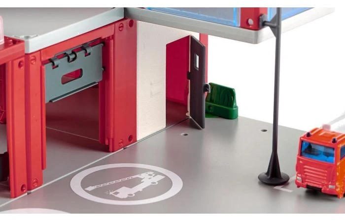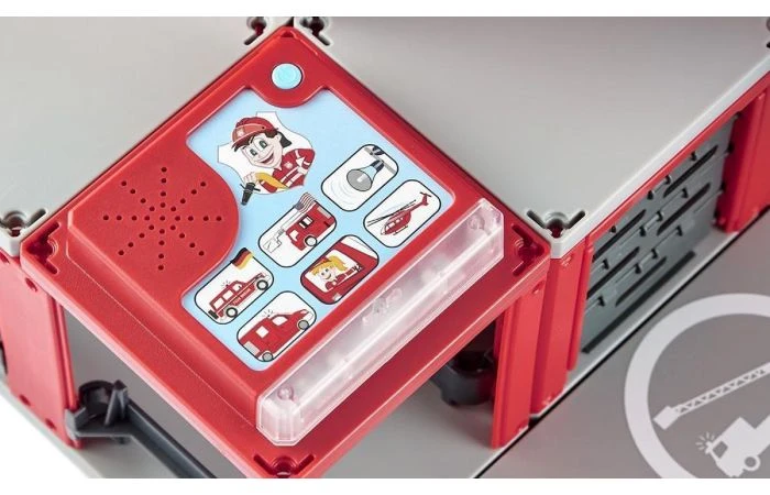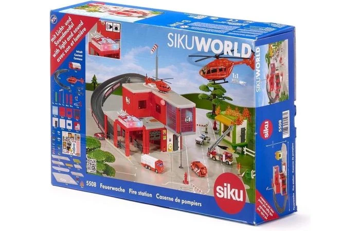 brandweer: er is brand! De brandweer is meteen startklaar, de roldeuren gaan open en de brandweerwagen is meteen onderweg. Tatuu tatuu: met de geïntegreerde Light & Sound module met knipperende LED’s en zes verschillende geluiden wordt de kinderkamer tot plaats van handeling. Gearriveerd: uit het dak van een kleine buurtwinkel slaan vlammen, goed dat er direct daarnaast een hydrant met slang en spuit staat. Water aan! SIKUWORLD groeit verder met de nieuwe brandweerkazerne. Het gebouw van twee verdiepingen kan aan de hand van de duidelijk geïllustreerde handleiding in elkaar worden gezet. Uit de bouwelementen ontstaan ook bijzondere en individuele gebouwen in L- of U-vorm maar er ontstaan ook gebouwen van meerdere verdiepingen. Door de modulaire opbouw en de stevigheid van de steekverbindingen kunnen de kinderen hun creativiteit zonder beperkingen botvieren. Door het siku steeksysteem worden hierbij spelenderwijs de motorische en cognitieve vaardigheden van het kind ontwikkeld. De mogelijkheid om iets te maken zonder hulp van volwassenen versterkt bovendien het zelfvertrouwen.De brandweerkazerne is compatibel met de andere sets van SIKUWORLD maar er kan ook zelfstandig mee worden gespeeld. Met de hydrant met slang en spuit, de glijstang, roldeur, satellietinstallatie en de windzak is de brandweerkazerne zeer gedetailleerd uitgerust. Veel spelplezier belooft ook de landingsplaats voor een helikopter op het dak van het gebouw en het snelle vertrek. Een brandweerwagen en een brandweerhelikopter worden meegeleverd. Vanzelfsprekend kan de SIKUWORLD met de vele siku brandweervoertuigen worden gecombineerd. installatietijd: 32 minuten