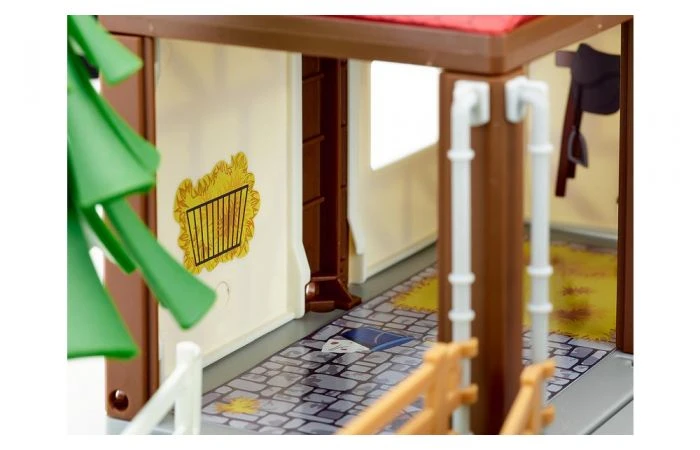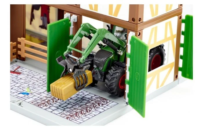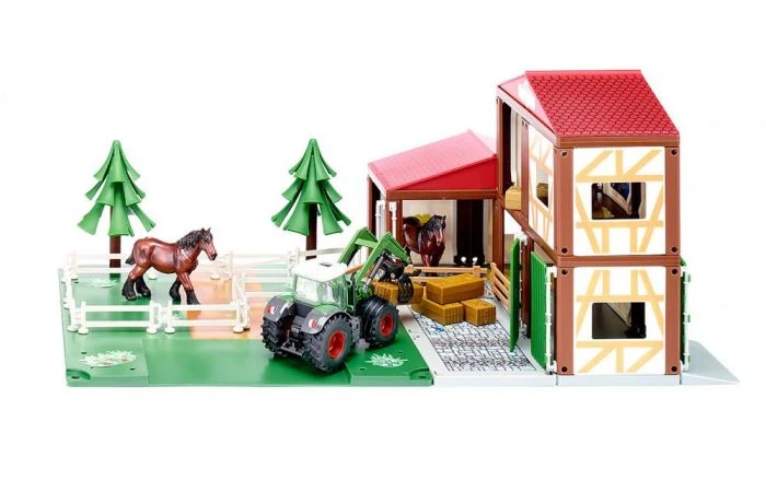 De set vormt een ideale uitbreiding op de SIKUWORLD maar zorgt ook op zichzelf als eigen speelwereld voor veel speelplezier. De SIKUWORLD paardenfarm geeft kinderen inspiratie voor een nieuwe speelwereld met dieren en een landelijk leven op de boerderij. Paarden die in de wei staan begroeten de paardenliefhebber met een hard gehinnik: de volgende rit staat voor de deur. maar er moet eerst nog een en ander op de boerderij gebeuren. Met de meegeleverde Fendt 939 tractor en de balengrijper worden de hooibalen op de hooizolder opgeslagen. De gebouwen in vakwerkstijl kunnen met behulp van het steeksysteem intuïtief en voor kinderen eenvoudig worden samengevoegd en naar eigen ideeën worden aan- en omgebouwd. Het gebouw met twee verdiepingen beschikt over een doorgang en er kan in de paardenstallen en de hooizolder worden gespeeld.