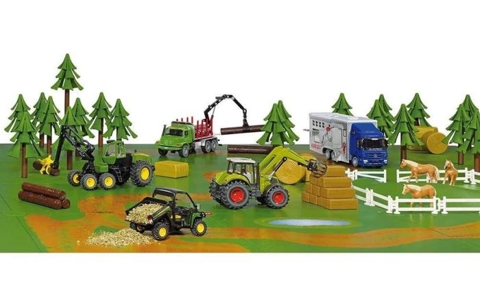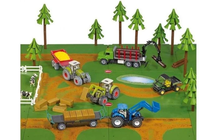 Deze aanvulling op het SIKUWORLD-Farmer thema omvat een veldweg met een meer, een onverharde weg en een geperforeerde plaat met bomen.