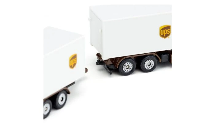 De bruine bestelwagens van UPS maken al jarenlang deel uit van het straatbeeld. De flinke bezorgers springen uit de wagens en sprinten met het pakket naar de klant. Maar hoe komt het pakket bij de bezorger? Met de UPS Logistiek set wordt de gecompliceerde logistiek van de pakketbezorging begrijpelijk uitgelegd en wordt het een spannend spelthema. De set bestaat uit een vorkheftruck, een 3-assige trekker en een bestelwagen in de bekende UPS kleuren. De hefmast van de Linde vorkheftruck kan bewegen en daarmee kan ook de kofferopbouw worden geladen. Hiervoor kunnen de achterdeuren worden geopend. De chauffeurscabine en de chassis van de 3-assige trekker en de middenasaanhangwagen zijn van metaal. Ook de bestelwagen is volledig van metaal.
