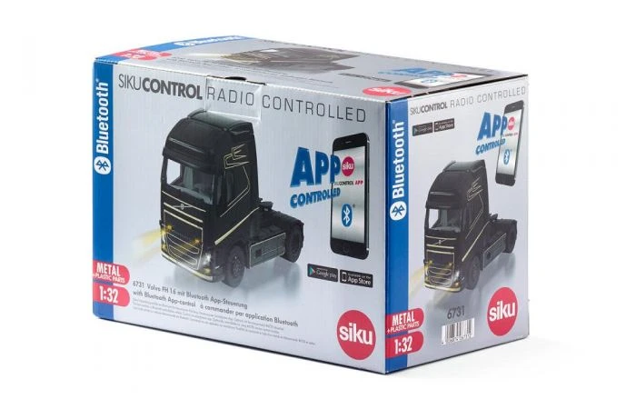 Zweedse truck met de app besturenPower, detail en hoge functionaliteit – en dat alles is met de smartphone of tablet te besturen. Dit heeft de nieuwe SIKUCONTROL Volvo FH16 4×2 te bieden, mogelijk gemaakt door de SIKU app en Bluetooth technologie. De vele functies van de trekker uit Zweden garanderen veel speelplezier De SIKUCONTROL-truck van metaal en kunststof onderscheidt zich niet alleen door de talrijke features maar ook door de aandacht voor details die de fans weten te waarderen. De chauffeurscabine van metaal is matzwart gelakt en gedetailleerd bedrukt. Alle functies, LED-verlichting en de twee transmissies van de Volvo FH16 4×2 kunnen via de app worden bediend, of naar keuze ook via de virtuele joystick bediening of de bewegings- en kantelsensoren van het mobiele apparaat. Deze intuïtieve feature is een welkome afwisseling en zorgt voor extra plezier bij het spelen. De Volvo-truck wordt via een as aangedreven. Met de app is zowel nauwkeurig rangeren mogelijk als het aan- en afkoppelen van de 3-assige kipper-oplegger (artikel 6734). Bovendien is in de trekker een databus ingebouwd om de besturing aan de oplegger door te geven.