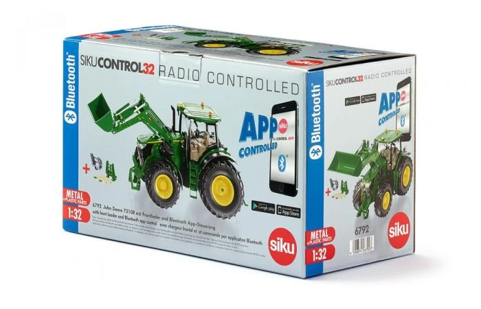 App downloaden, Bluetooth-verbinding inschakelen en spelen. Met de nieuwe SIKUCONTROL app kan de John Deere 7310R met frontlader met de smartphone of met een tablet (Android en iOS) worden bestuurd. De tractor is ook als set leverbaar inclusief de Bluetooth module voor de afstandsbediening. De John Deere 7310R is de sterkste vertegenwoordiger van de serie 7R. Het SIKUCONTROL-model van metaal en kunststof onderscheidt zich niet alleen door de talrijke features maar ook door de aandacht voor details die de fans weten te waarderen. Alle functies en de vijf transmissies van de tractor kunnen via de app worden bediend, naar keuze via de virtuele joystickbediening of de bewegings- en kantelsensoren van het mobiele apparaat. Deze intuïtieve feature is een welkome afwisseling en zorgt voor extra plezier bij het spelen. Met de app is nauwkeurig rangeren mogelijk en kunnen de frontlader, de aanhanger van Joskin & Fortuna of de ploeg van Vogel & Noot worden bediend en bestuurd. Net zoals bij de module voor afstandsbediening kunnen bovendien de rijverlichting op de motorkap, de werkschijnwerpers aan de cabine, de knipperlichten achter en de verlichting rondom worden ingeschakeld. De SIKUCONTROL app geeft tractorfans daarnaast nog interessante informatie over de John Deere 7310R tractor. Het is ook mogelijk om een naam voor de tractor op te slaan. De instellingen en functies van de app worden permanent bijgewerkt. Met behulp van de OTA-functie (Over-The-Air) van de app kunnen software-updates voor de tractor direct worden geïnstalleerd.