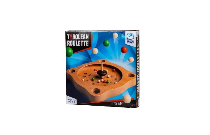 Clown Games Tiroler Roulette van hout. Je speelt dit spel op een houten speelbord, dat meerdere uitsparingen heeft, plus 4 hoekgaten. Met de tol probeer je de balletjes naar plekken te spelen, die de meeste punten opleveren. Wie het eerst het afgesproken aantal punten haalt, heeft gewonnen! Geschikt voor zowel kinderen als volwassenen: 2 tot 6 spelers vanaf 5 jaar.